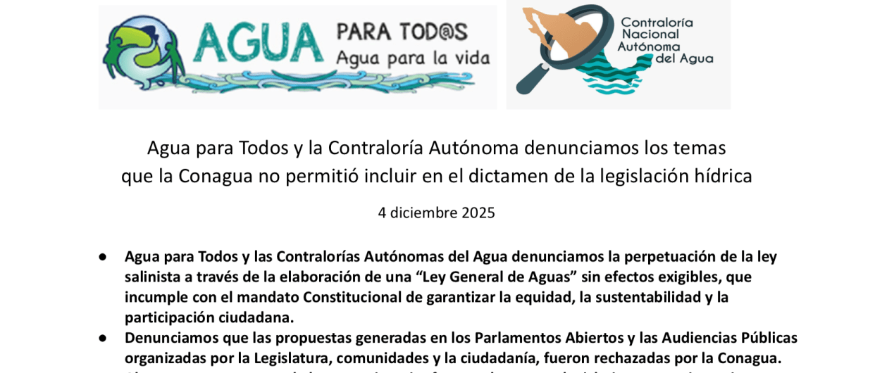 Organizaciones civiles denunciaron que Conagua impuso la nueva Ley General de Aguas sin permitir cambios sustanciales ni incorporar propuestas ciudadanas surgidas en foros públicos, perpetuando un marco legal que favorece el acaparamiento y mantiene prácticas opacas en la gestión del agua.