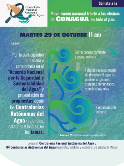 Este 29 de octubre, la Contraloría Nacional Autónoma del Agua presentará en las oficinas de la Comisión Nacional del Agua cinco propuestas para el “Acuerdo Nacional por la Seguridad y Sustentabilidad del Agua” anunciado por la presidenta de la República, Claudia Sheinbaum Pardo.